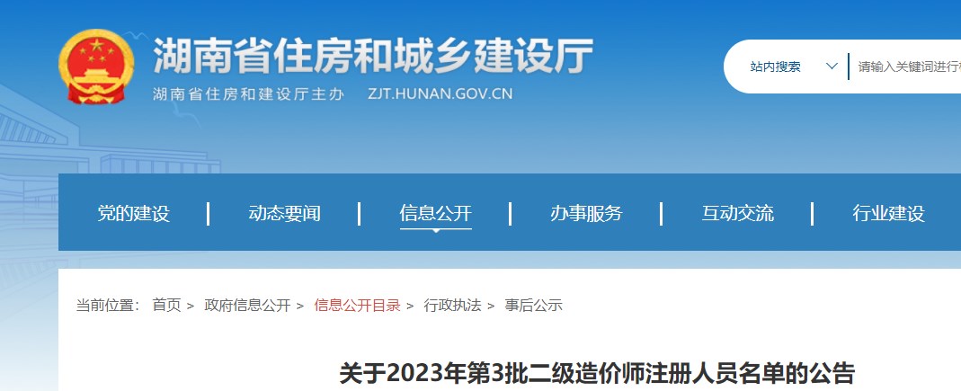 湖南省關(guān)于2023年第3批二級造價(jià)師注冊人員名單的公告