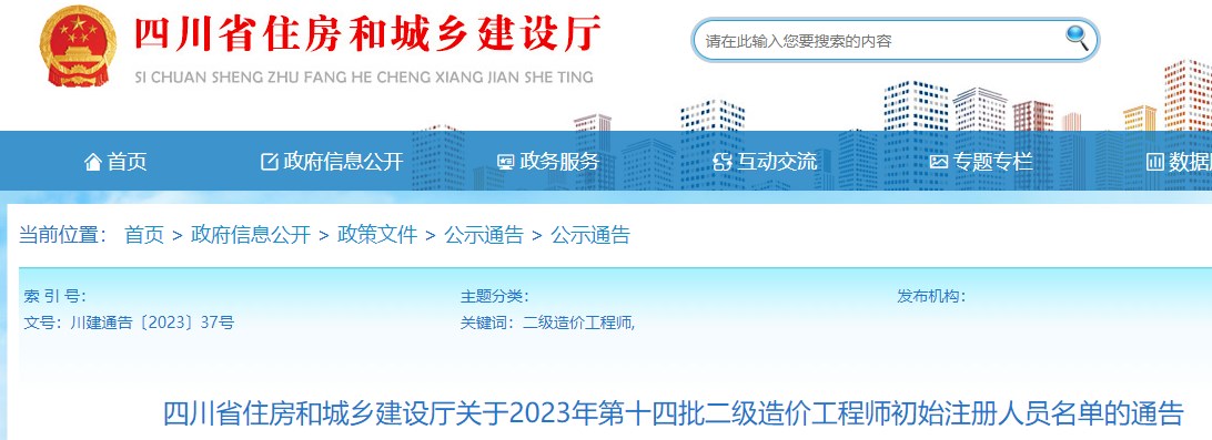 四川省住房和城鄉(xiāng)建設(shè)廳關(guān)于2023年第十四批二級(jí)造價(jià)工程師初始注冊人員名單的通告