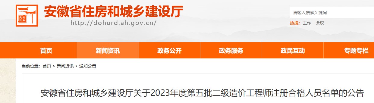 安徽省住房和城鄉(xiāng)建設(shè)廳關(guān)于2023年度第五批二級(jí)造價(jià)工程師注冊(cè)合格人員名單的公告
