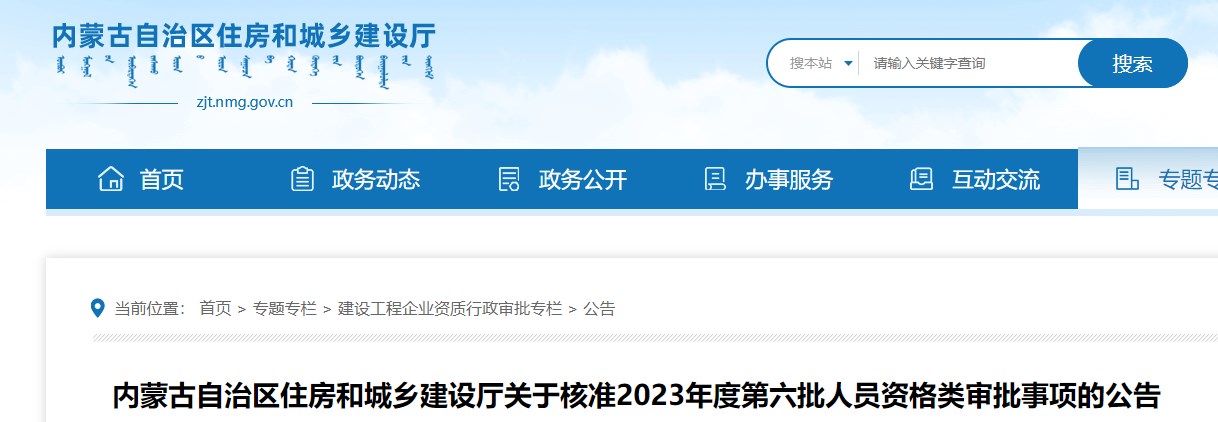 內(nèi)蒙古自治區(qū)住房和城鄉(xiāng)建設(shè)廳關(guān)于核準(zhǔn)2023年度第六批人員資格類審批事項的公告