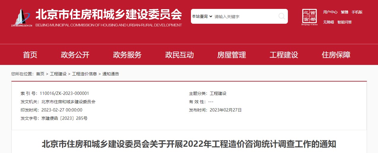 北京市住房和城鄉(xiāng)建設委員會關于開展2022年工程造價咨詢統(tǒng)計調(diào)查工作的通知