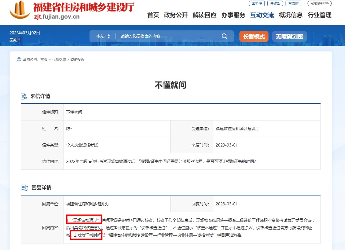 近日,有考生就證書領(lǐng)取的問(wèn)題咨詢了福建省住建廳,得到官方回復(fù)。
