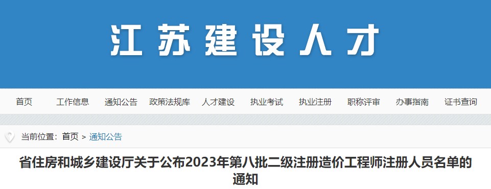 江蘇省關(guān)于公布2023年第八批二級(jí)造價(jià)師注冊(cè)人員名單的通知