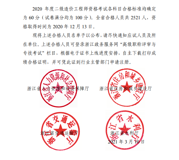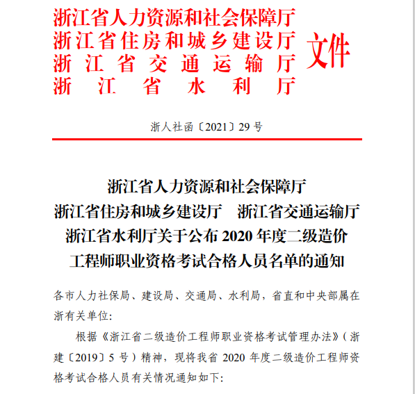 關(guān)于公布浙江2020年度二級造價(jià)工程師職業(yè)資格考試合格人員名單的通知