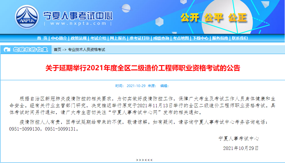 疫情防控人人有責(zé),因考試延期給帶來的不便,敬請諒解。如有疑問,請咨詢寧夏人事考試中心考務(wù)咨詢電話:0951-5099130,0951-5099131。