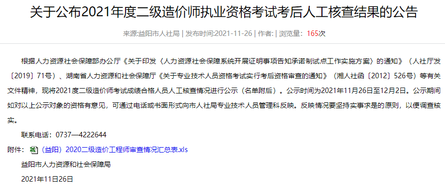 根據(jù)人力資源社會(huì)保障部辦公廳《關(guān)于印發(fā)〈人力資源社會(huì)保障系統(tǒng)開展證明事項(xiàng)告知承諾制試點(diǎn)工作實(shí)施方案〉的通知》(人社廳發(fā)〔2019〕71號(hào))、湖南省人力資源和社會(huì)保障廳《關(guān)于專業(yè)技術(shù)人員資格考試實(shí)行考后資格審查的通知》(湘人社函〔2012〕526號(hào))等有關(guān)文件精神,現(xiàn)將2021度二級(jí)造價(jià)師考試成績合格人員人工核查情況進(jìn)行公示(名單附后)。公示時(shí)間為2021年11月26日至12月2日。公示期間如對(duì)以上公示對(duì)象的資格有意見,可通過電話或書面形式向市人社局專業(yè)技術(shù)人員管理科反映。反映情況要堅(jiān)持實(shí)事求是的原則,以便調(diào)查核實(shí)。