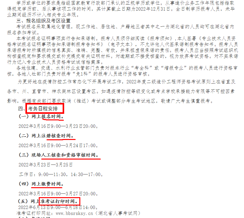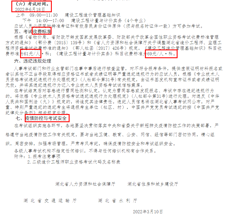 湖北2022年二級造價工程師考試考務工作通知