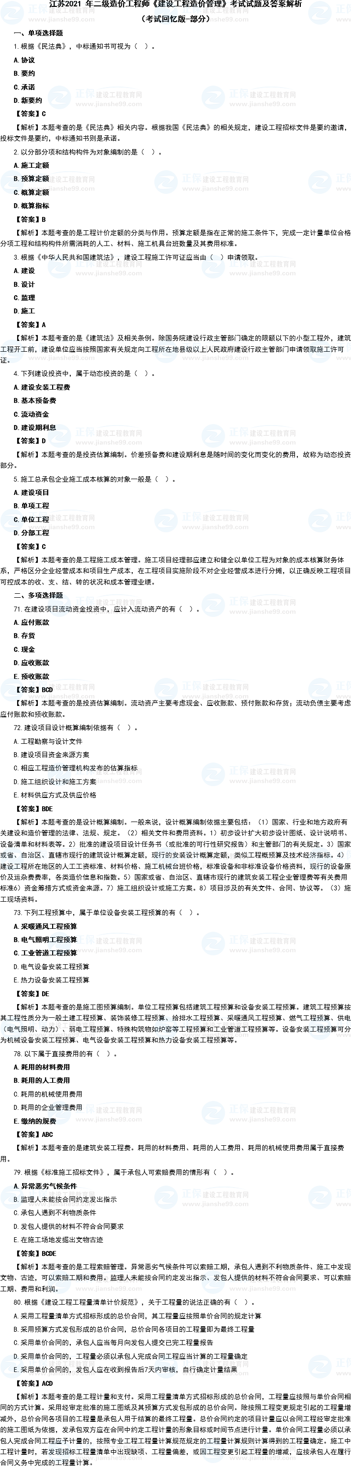 江蘇2021年二級(jí)造價(jià)師《造價(jià)管理》考試試題及答案解析(考生回憶版)