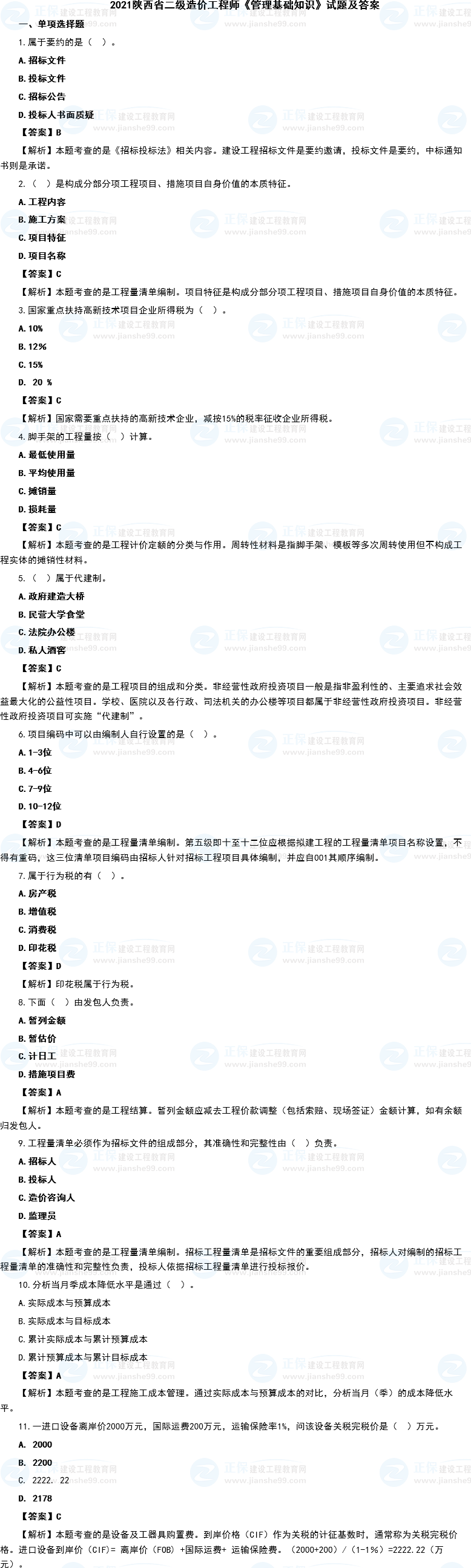 陜西2021年二級(jí)造價(jià)師《造價(jià)管理》考試試題及答案解析(考生回憶版)