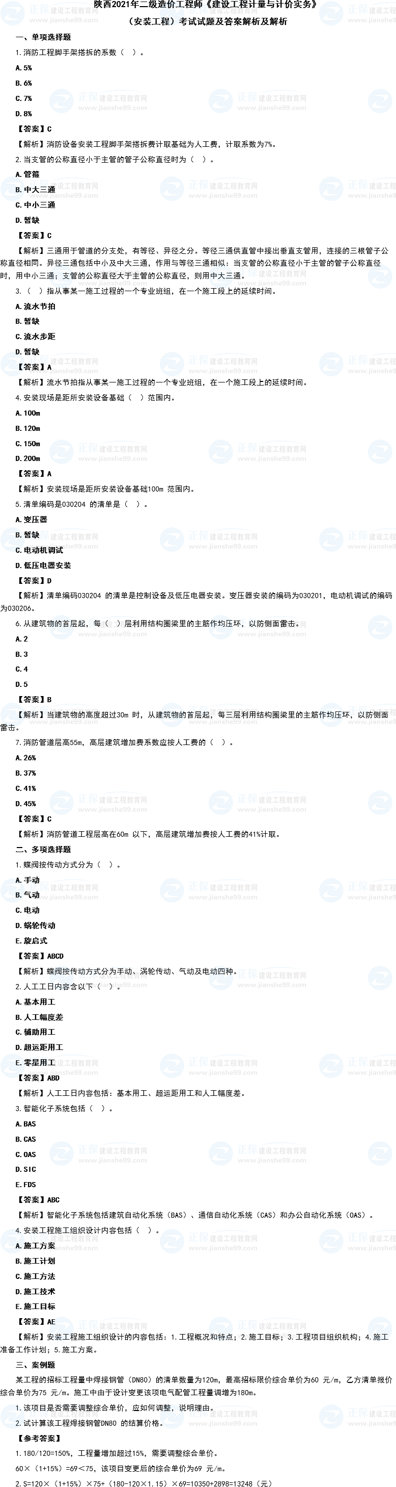 陜西2021年二級(jí)造價(jià)師《安裝實(shí)務(wù)》考試試題及答案解析(考生回憶版)