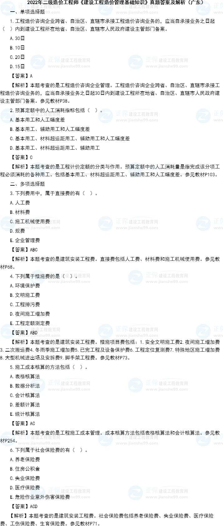 廣東?2022年二級造價師《建設工程造價管理基礎知識》試題答案及解析