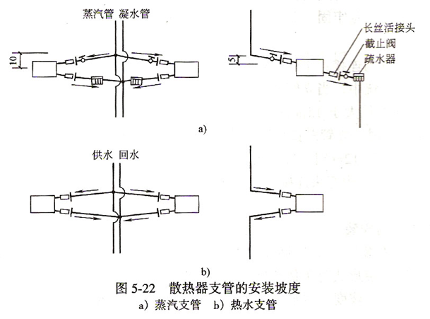 4.水平管道坡度 熱水采暖及汽水同向的蒸汽和凝結(jié)水管,坡度一般為3‰ 。