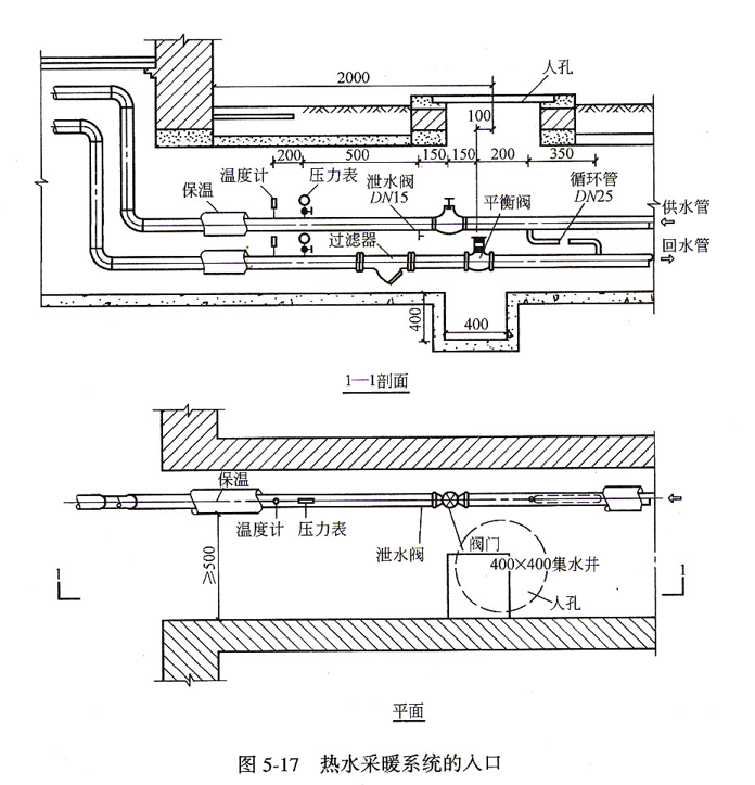 (二)總管及入口裝置的安裝采暖系統(tǒng)室內(nèi)外界限以入口閥門為界。