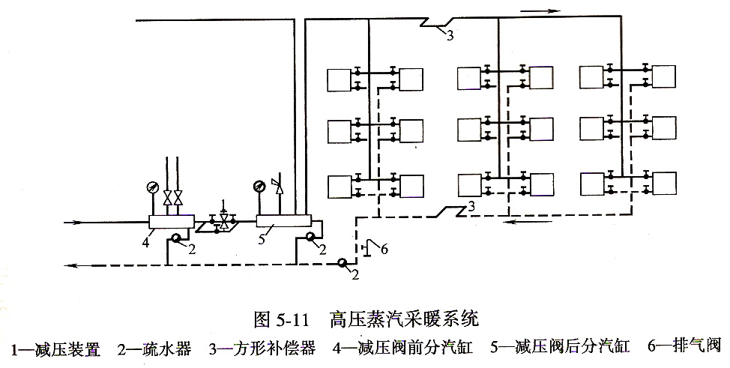 (2)高壓蒸汽采暖系統(tǒng)高壓蒸汽采暖系統(tǒng)由室外管網(wǎng)引入,在建筑物入口處設(shè)有分氣缸和減壓裝置。