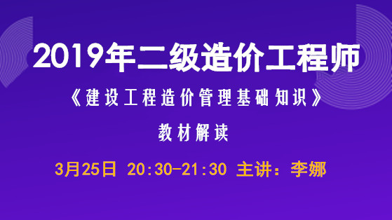 為了更好有針對(duì)性的幫助備考2019年二級(jí)造價(jià)師考試的學(xué)員們復(fù)習(xí),斬獲高分!建設(shè)工程教育網(wǎng)的美女李娜老師將在3月25日晚上20:30-21:30免費(fèi)直播一場關(guān)于2019年二級(jí)造價(jià)工程師《建設(shè)工程造價(jià)管理基礎(chǔ)知識(shí)》教材的解讀課程!
