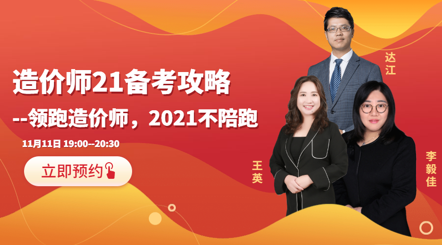 2020年一級造價師考試已經(jīng)結(jié)束,2021年一級造價師考試備考可以開始了!在新的一年怎么備考呢?2021年一級造價師考試不陪考,11月11日,在直播間王英、李毅佳、達江做客,等你!與你們不見不散!