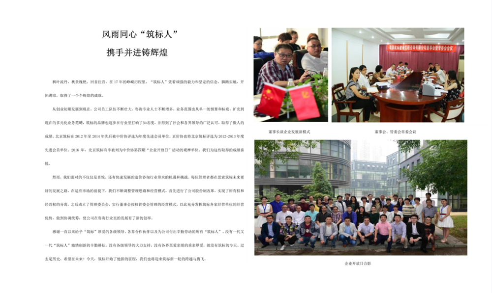 北京筑標(biāo)建設(shè)工程咨詢有限公司成立于1999年11月11日。分別在2003年和2005年取得建設(shè)工程造價(jià)咨詢、建設(shè)工程招標(biāo)代理甲級(jí)資質(zhì);2015年?duì)I業(yè)額達(dá)到1.1億元;自有員工400余人,造價(jià)工程師55人;現(xiàn)有自然人股東17人;公司建立了共產(chǎn)黨支部組織和工會(huì)組織。是中價(jià)協(xié)多年先進(jìn)會(huì)員單位和造價(jià)咨詢行業(yè)百?gòu)?qiáng)企業(yè)。