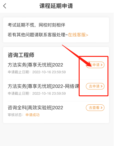 選擇你需要申請的延期課程,點擊“去申請”(尊享無憂班選擇其中一個申請即可)