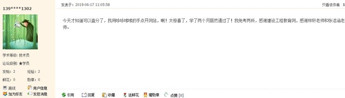 今天才知道可以查分了,我用哆哆嗦嗦的手點開網(wǎng)站,?。√@喜了,學(xué)了兩個月居然通過了!我免考兩科,感謝建設(shè)工程教育網(wǎng),感謝林軒老師和張潔涵老師。