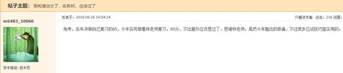 免考,去年決策自己復(fù)習(xí)的85,今年實務(wù)跟著林老師復(fù)習(xí),85分,不出意外應(yīng)該是過了。感謝林老師,雖然今年題出的很偏,不過很多應(yīng)試技巧蠻實用的。