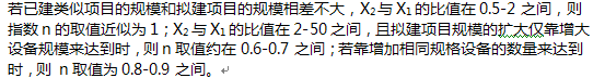 其他符號含義同前建設(shè)項目的投資額與生產(chǎn)能力呈非線性關(guān)系。運用該方法估算項目投資的重要條件,是要有合理的生產(chǎn)能力指數(shù)。不同性質(zhì)的建設(shè)項目,n 的取值是不同的。在正常情況下,0≤n≤1.