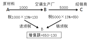 空調(diào)生產(chǎn)廠B銷售給經(jīng)銷商C時,銷售過程產(chǎn)生的增值稅650元,由C通過付款已經(jīng)給了B(收款)。在購買壓縮機時,空調(diào)生產(chǎn)廠B也是一個消費者,購買的原材料所產(chǎn)生的增值稅130元,在支付給壓縮機廠家價款時已經(jīng)支付給了壓縮機廠家A(支出),所以在給國家繳納稅款時就不應(yīng)該再承擔(dān)這部分的稅費,只對增值部分計稅。即應(yīng)納增值稅=銷項稅-進項稅=650-130=520元/臺。