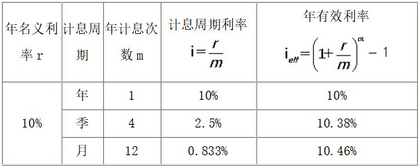 現(xiàn)設(shè)年名義利率為10%,則按年、季、月計息的年有效利率見下表。