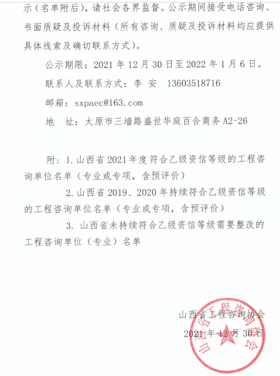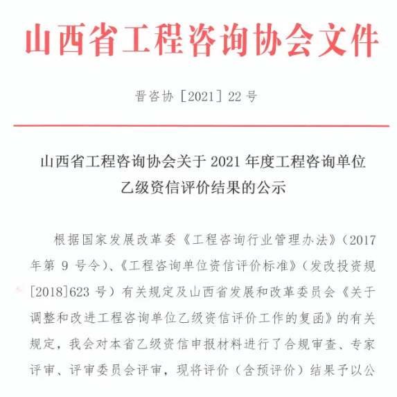 山西工程咨詢協(xié)會(huì)關(guān)于2021年度工程咨詢單位乙級(jí)資信評(píng)價(jià)結(jié)果的公示