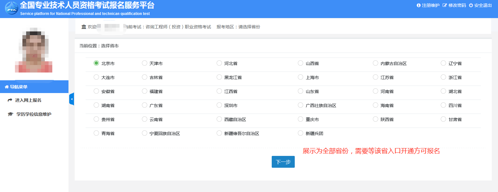 第二步:選擇你要報考的地區(qū);點擊下一步即可;