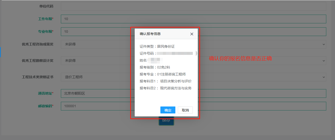 第八步:所有都填完了會彈出確認報考信息窗口,如果沒填完會提醒,不能保存;