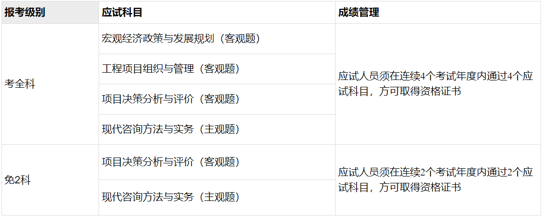 上述人員可免試部分科目,只參加《項目決策分析與評價》和《現(xiàn)代咨詢方法與實務(wù)》2個科目的考試。