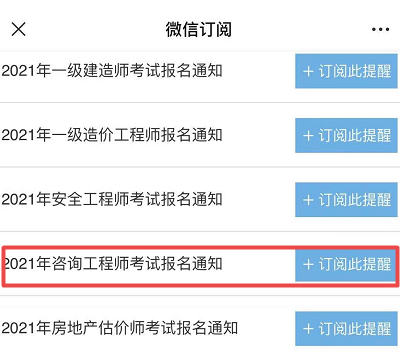 第三步:選擇“2021年咨詢工程師考試報(bào)名通知”-訂閱此提醒