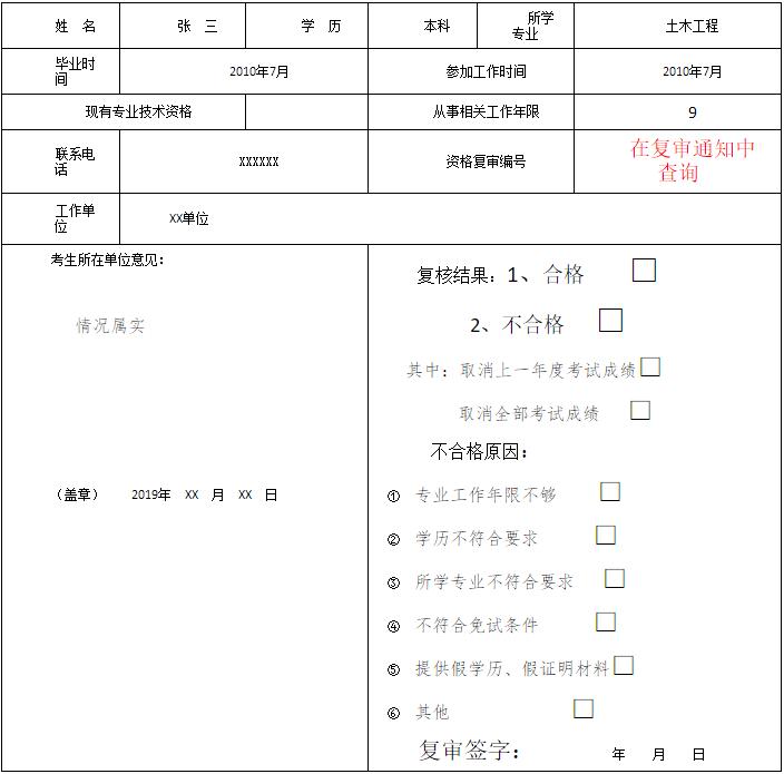 4、復審人員按照樣表填寫自己的實際情況。