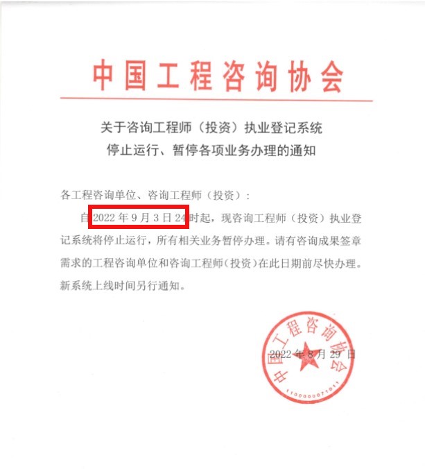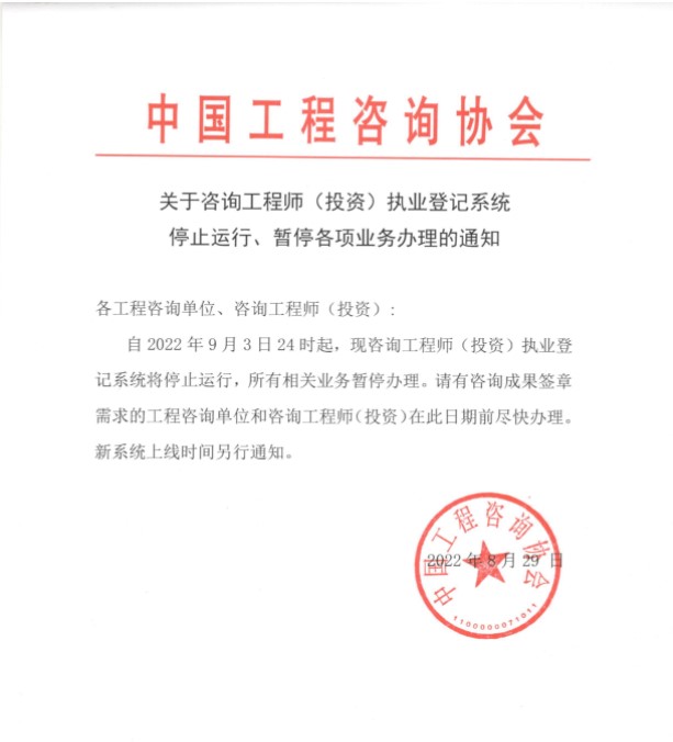 關(guān)于咨詢工程師(投資)執(zhí)業(yè)登記系統(tǒng)停止運(yùn)行、暫停各項(xiàng)業(yè)務(wù)辦理的通知