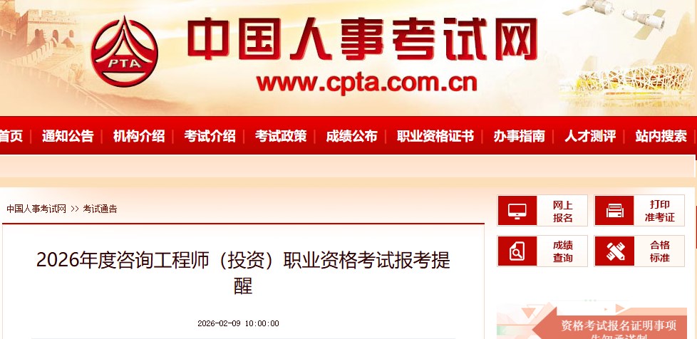 中國人事考試網發(fā)布2026年度咨詢工程師(投資)職業(yè)資格考試報考提醒,報名時間確定為:2月25日至3月11日,具體信息如下: