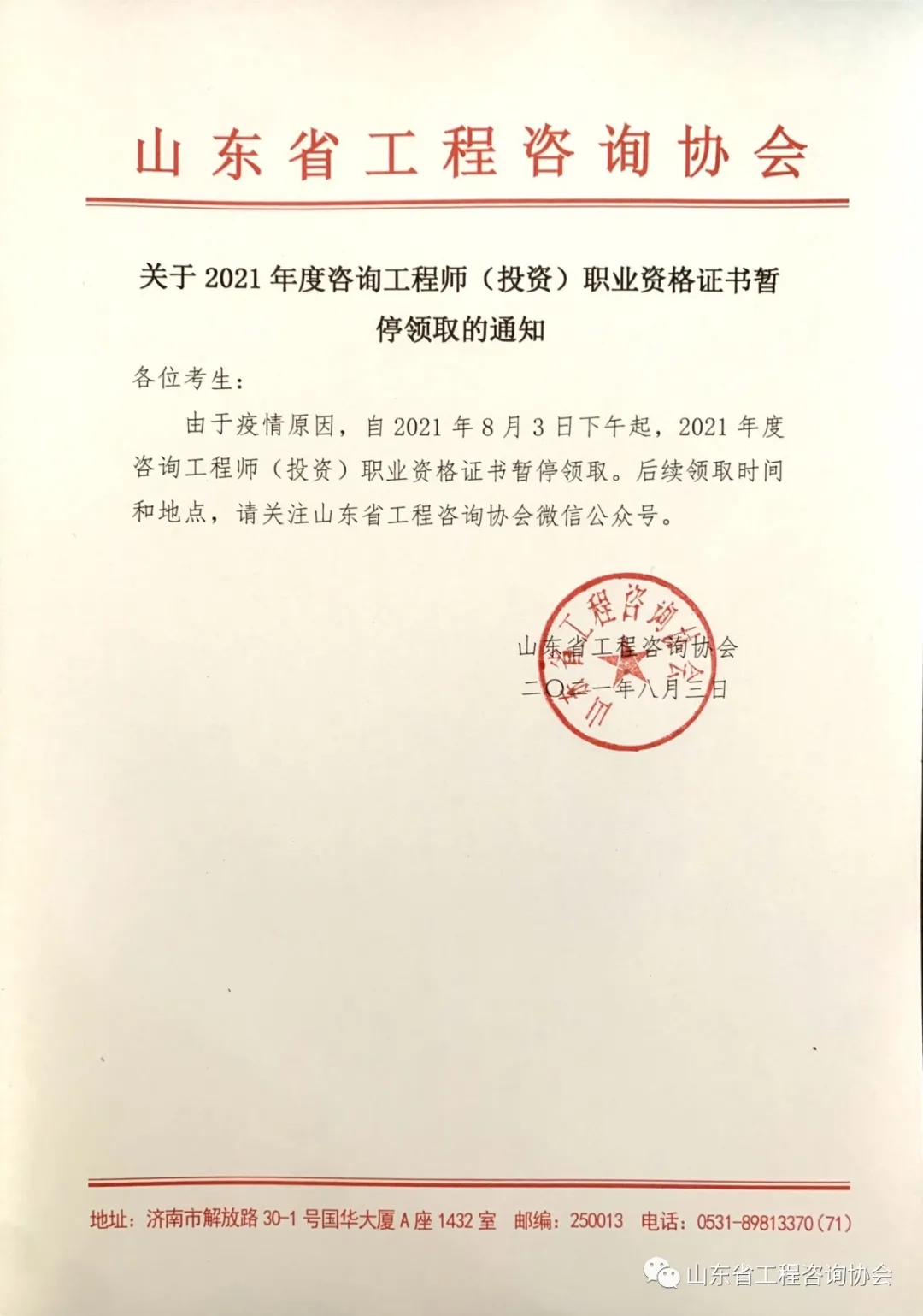 2021年度山東咨詢工程師(投資)職業(yè)資格證書暫停領取的通知
