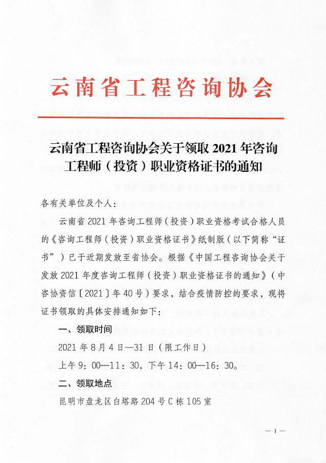 2021年云南領(lǐng)取咨詢工程師(投資)職業(yè)資格證書的通知
