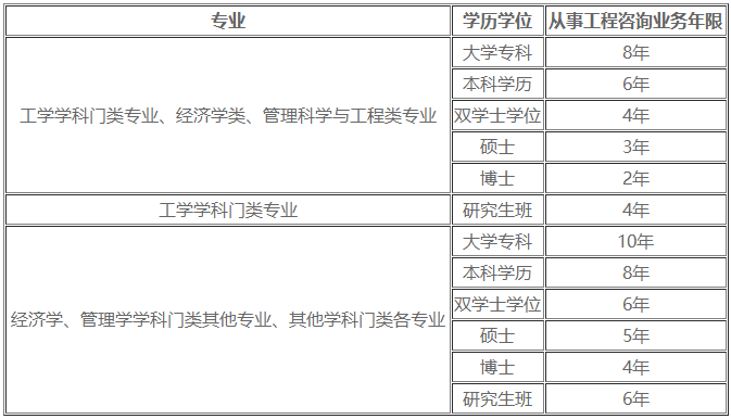 所學(xué)專業(yè)不屬于上述學(xué)科門類專業(yè)范圍的報考人員,其累計從事工程咨詢業(yè)務(wù)的年限均相應(yīng)增加2年。