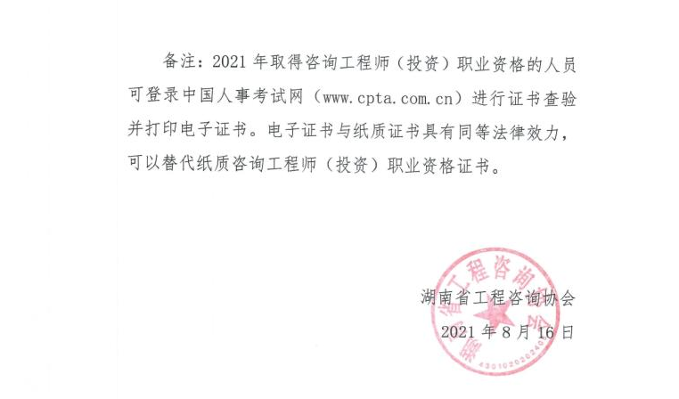 2021年湖南省咨詢工程師合格證書領(lǐng)取時間