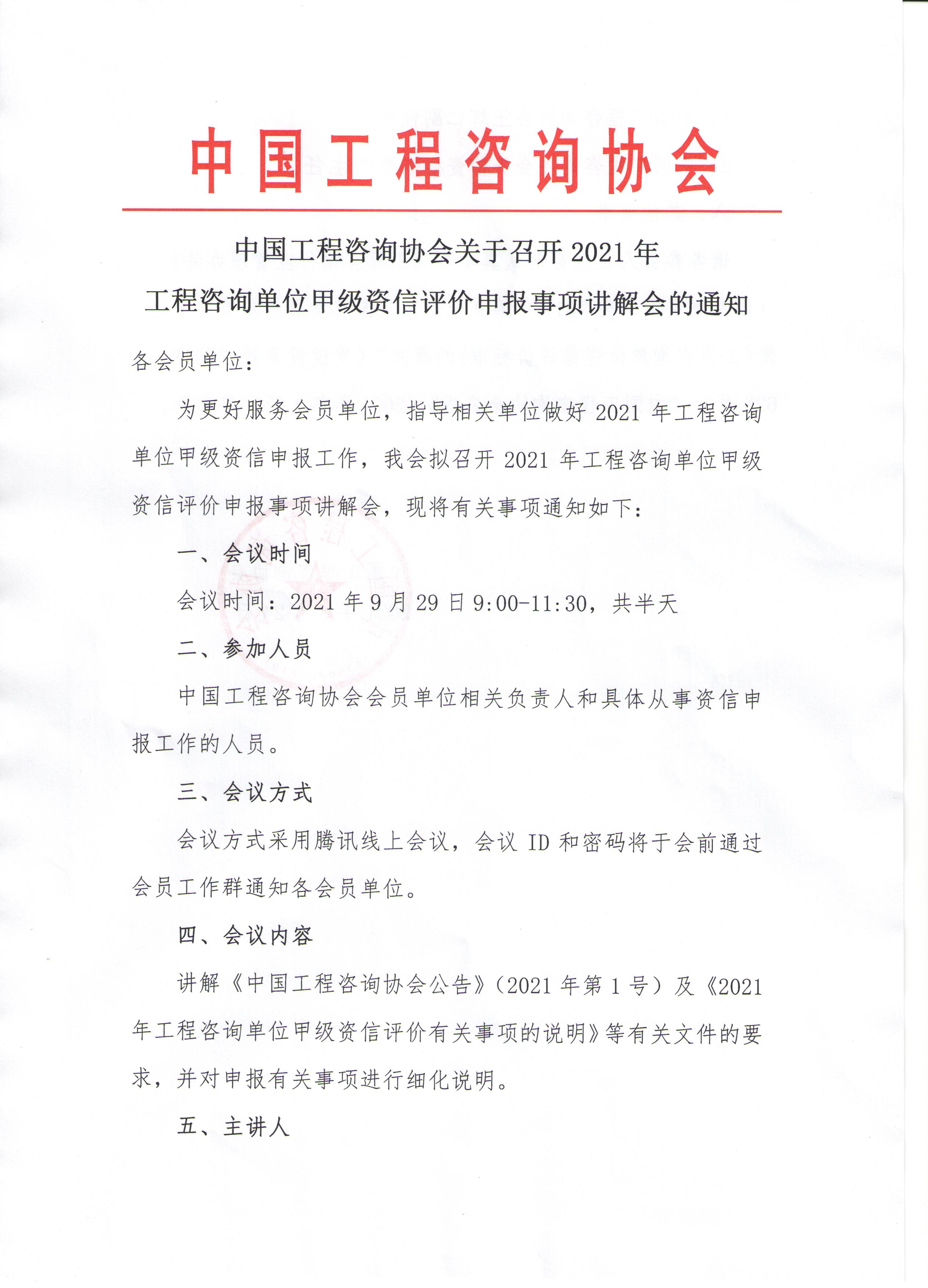 中國工程咨詢協(xié)會關于召開2021年工程咨詢單位甲級資信評價申報事項講解會的通知