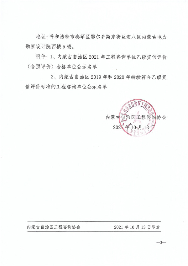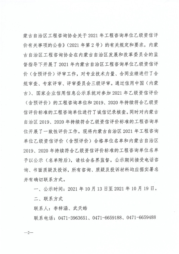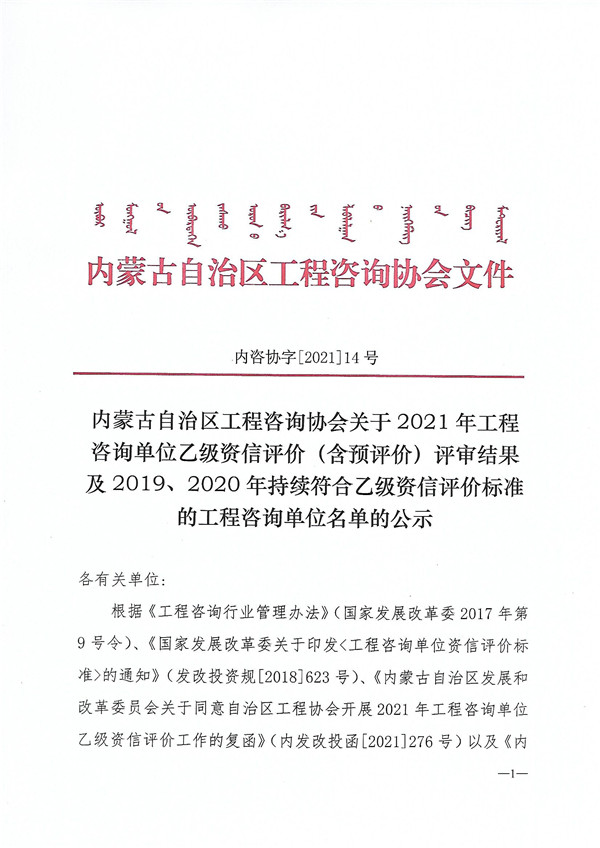 內(nèi)蒙古關(guān)于2021年工程咨詢單位乙級資信評價(含預(yù)評價)評審結(jié)果及2019、2020年持續(xù)符合乙級資信評價標準的單位名單的公示