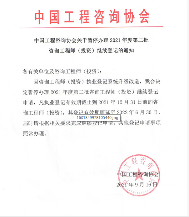 中國工程咨詢協(xié)會關于暫停辦理2021年度第二批咨詢工程師(投資)繼續(xù)登記的通知