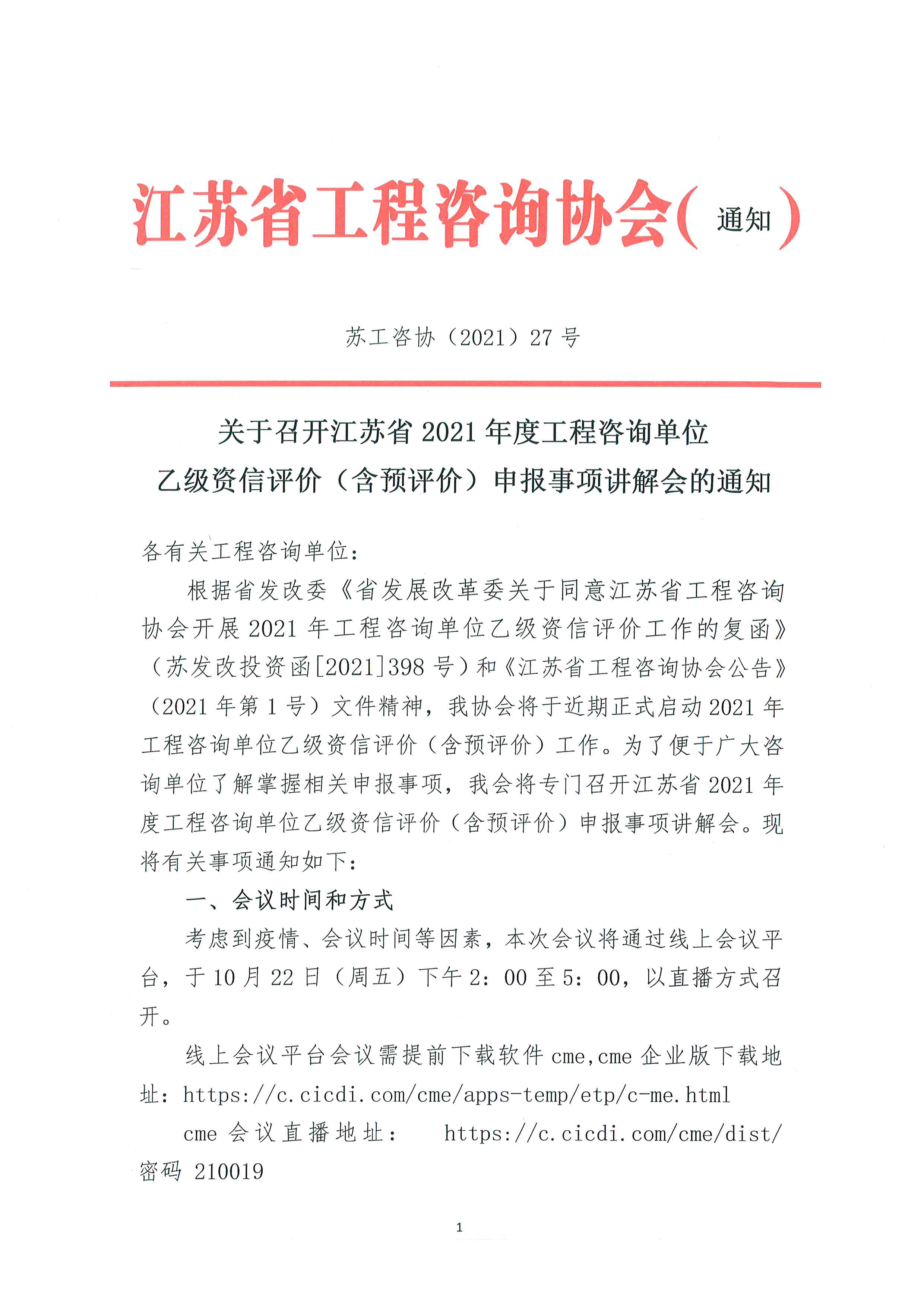 關(guān)于召開江蘇省2021年度工程咨詢單位乙級資信評價(jià)(含預(yù)評價(jià))申報(bào)事項(xiàng)講解會的通知