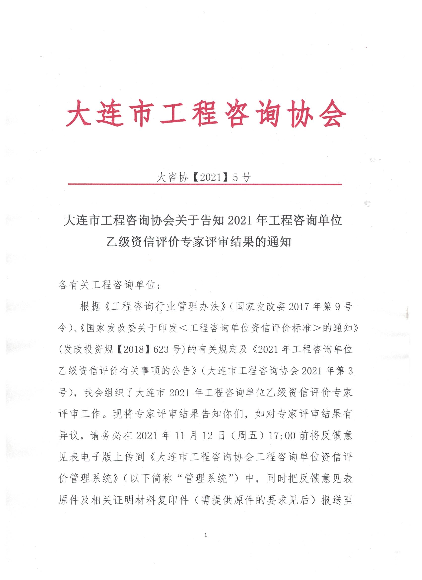 大連市工程咨詢協(xié)會(huì)關(guān)于告知2021年工程咨詢單位乙級(jí)資信評(píng)價(jià)專家結(jié)果的通知