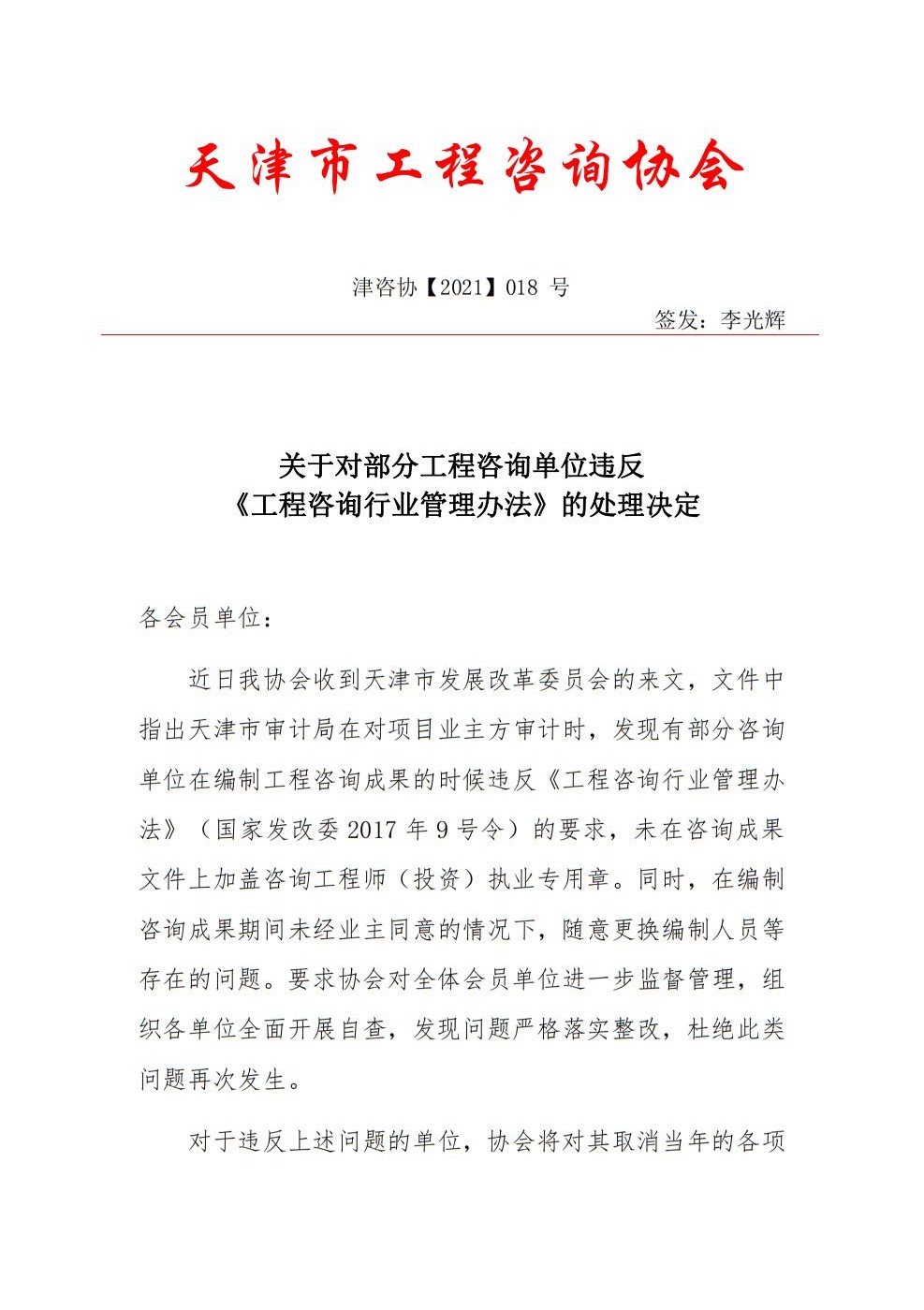 關(guān)于對(duì)部分工程咨詢單位違反《工程咨詢行業(yè)管理辦法》的處理決定