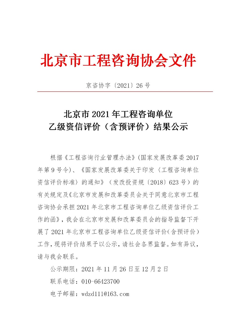 北京市2021年工程咨詢單位乙級(jí)資信評(píng)價(jià)(含預(yù)評(píng)價(jià))結(jié)果公示