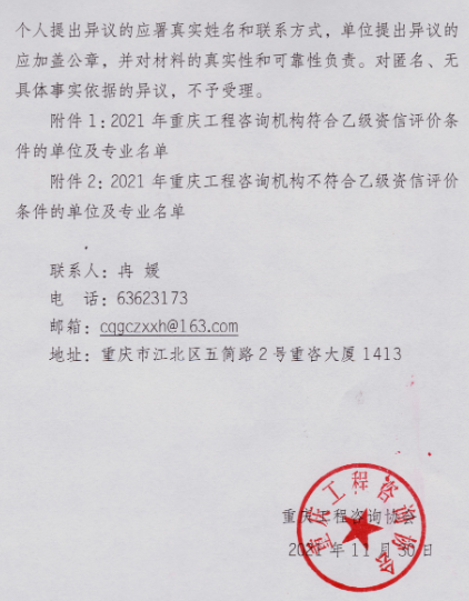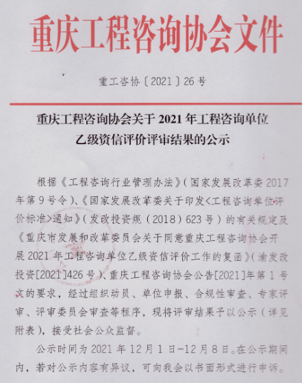 重慶工程咨詢協(xié)會關(guān)于2021年工程咨詢單位乙級資信評價評審結(jié)果的公示