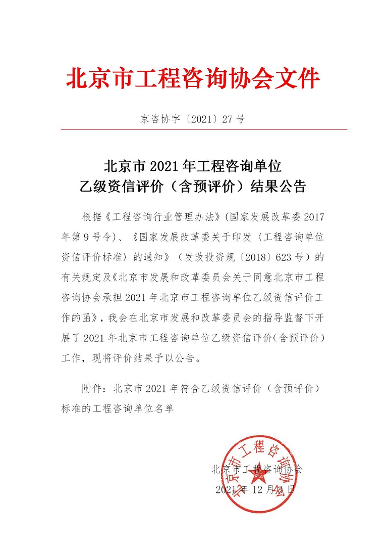 北京市2021年工程咨詢單位乙級資信評價(含預(yù)評價)結(jié)果公告