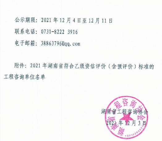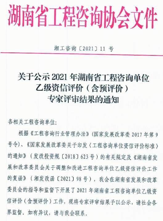 關(guān)于公示2021年湖南省工程咨詢單位乙級資信評價(含預(yù)評價)專家評審結(jié)果的通知