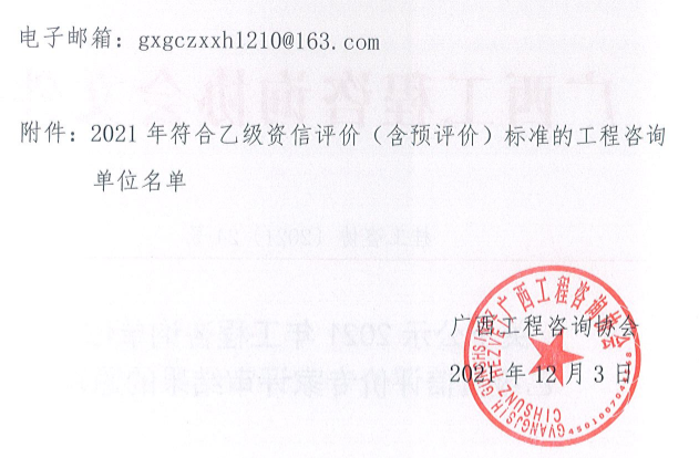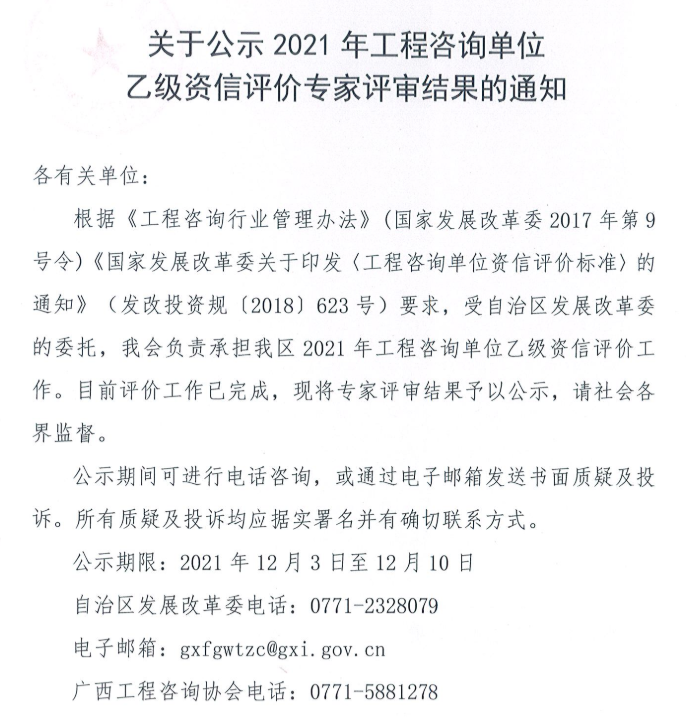 關(guān)于公示廣西省2021年工程咨詢單位乙級(jí)資信評(píng)價(jià)專家評(píng)審結(jié)果的通知